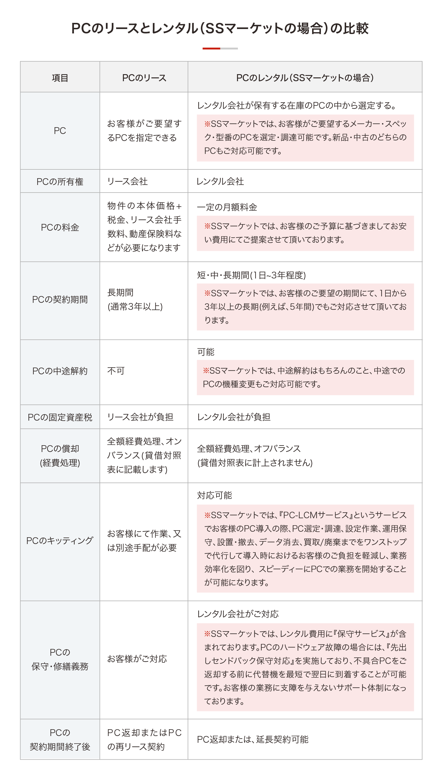 PCのリースとレンタル(SSマーケットの場合)の違いにつきましては下記の表をご覧ください。